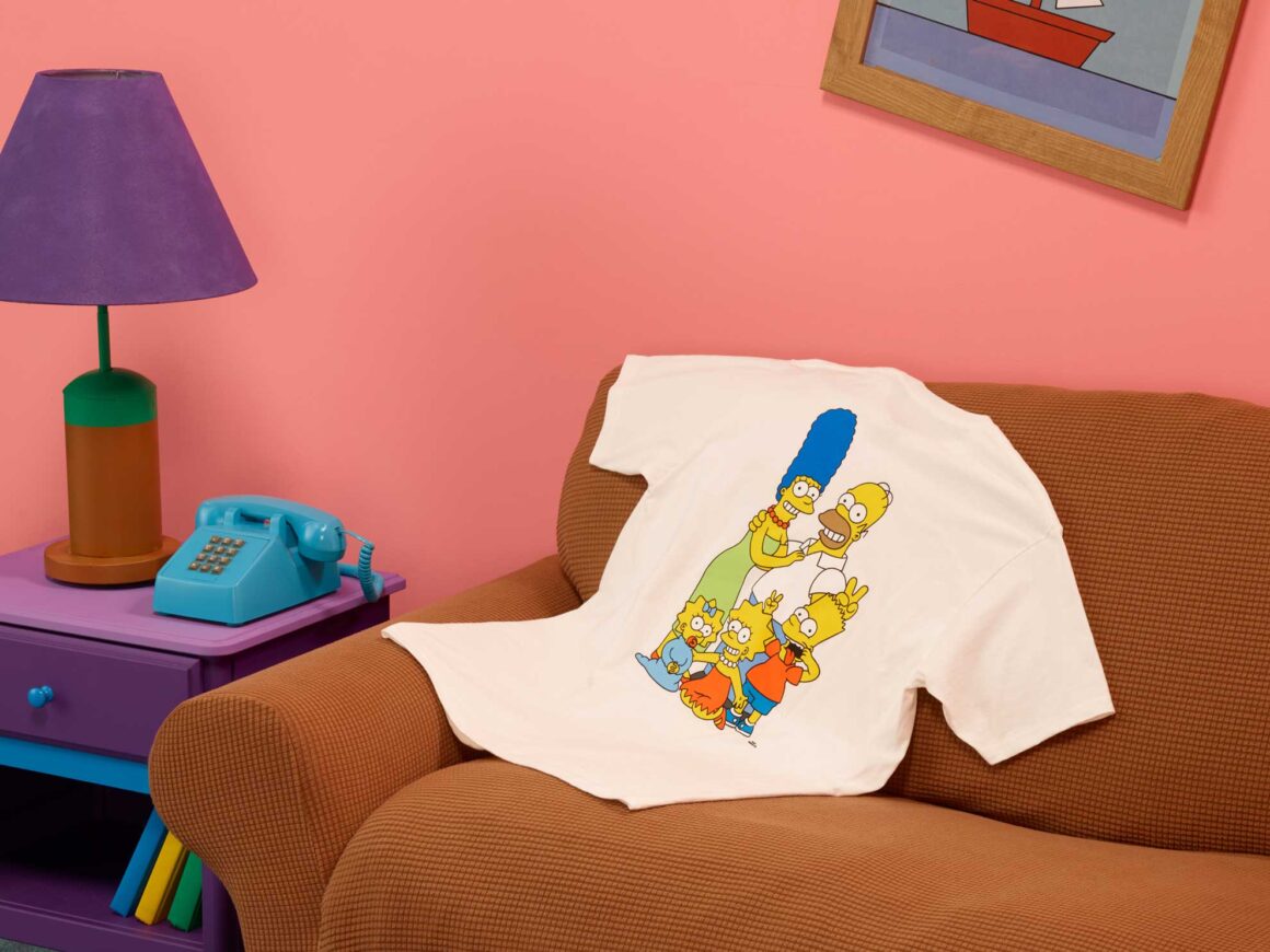 Para la ropa de hombre, la camiseta de manga corta de Los Simpsons presenta un logotipo en el pecho y una escena familiar en la parte posterior, un tributo a la famosa introducción del sofá.